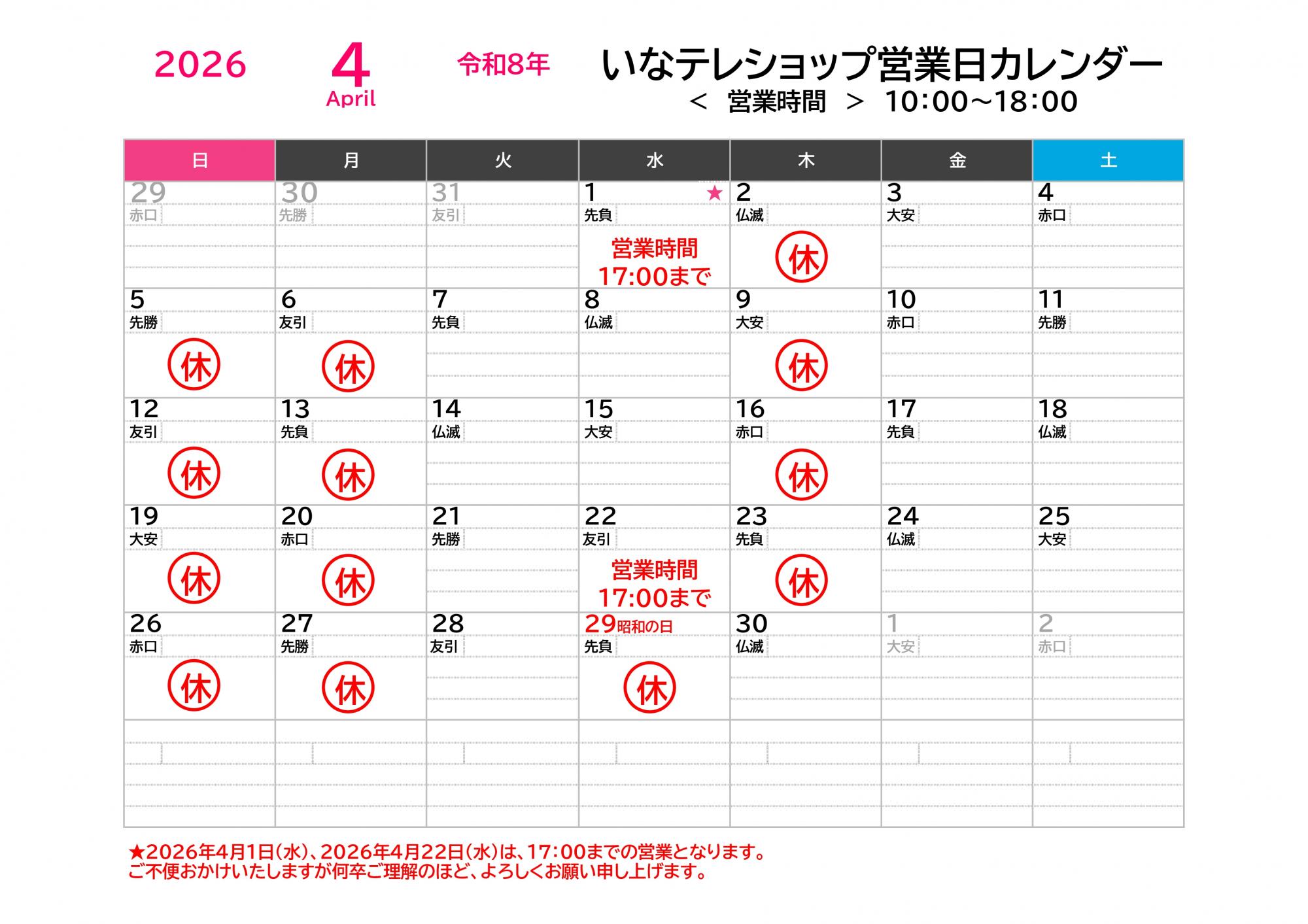4月22日(水)は営業時間を 10:00~17:00 とさせていただきます。