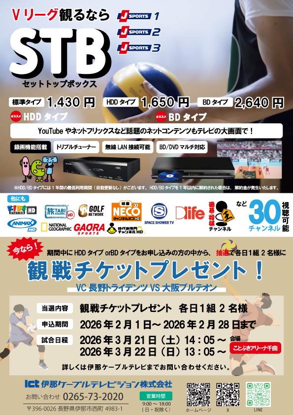 ・伊那ケーブルテレビジョン株式会社 営業課 TEL:0265-73-2020