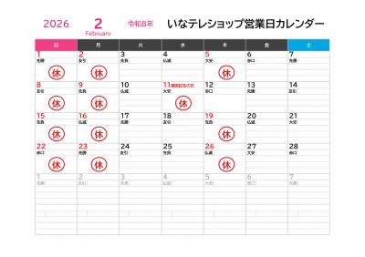 2026年2月のいなテレショップ定休日は画像の通りです。