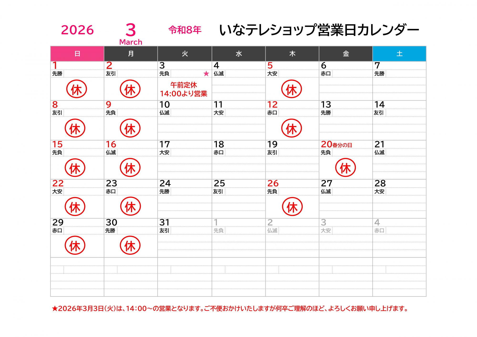 2026年3月のいなテレショップ定休日は画像の通りです。